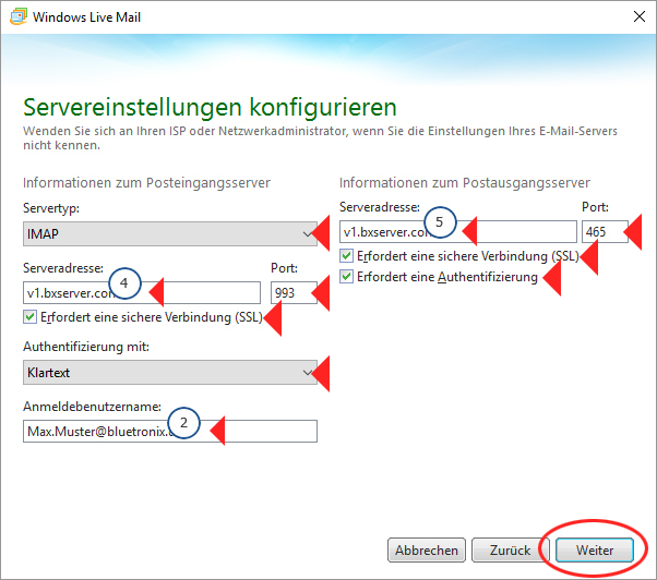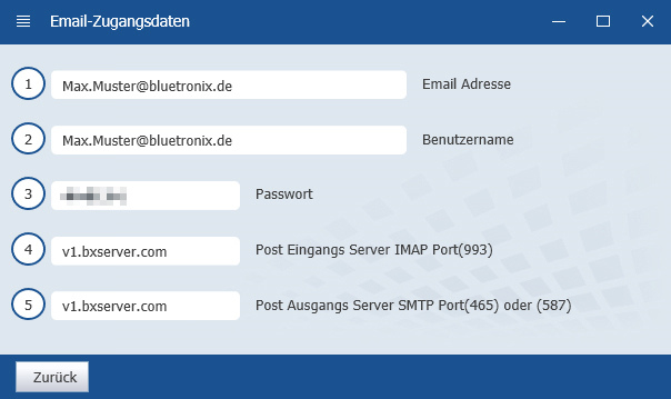 Füllen Sie die Felder "Serveradresse", "Serveradresse Ausgang" und "Anmeldebenutzername" mit den Daten aus Ihren Zugangsdaten 245