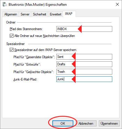 Klicken Sie auf Konten▶Eigenschaften und anschließend auf die Registerkarte IMAP.